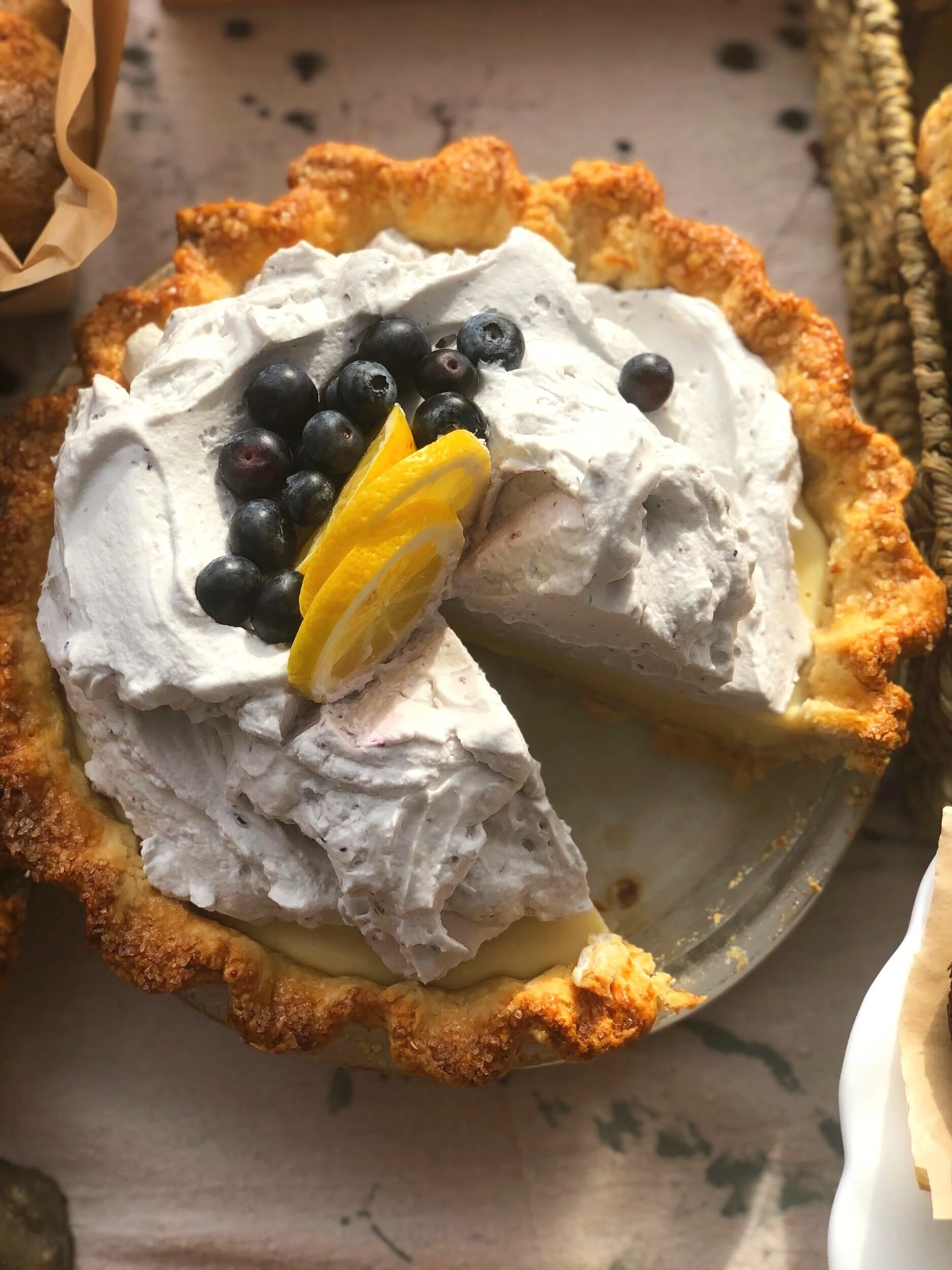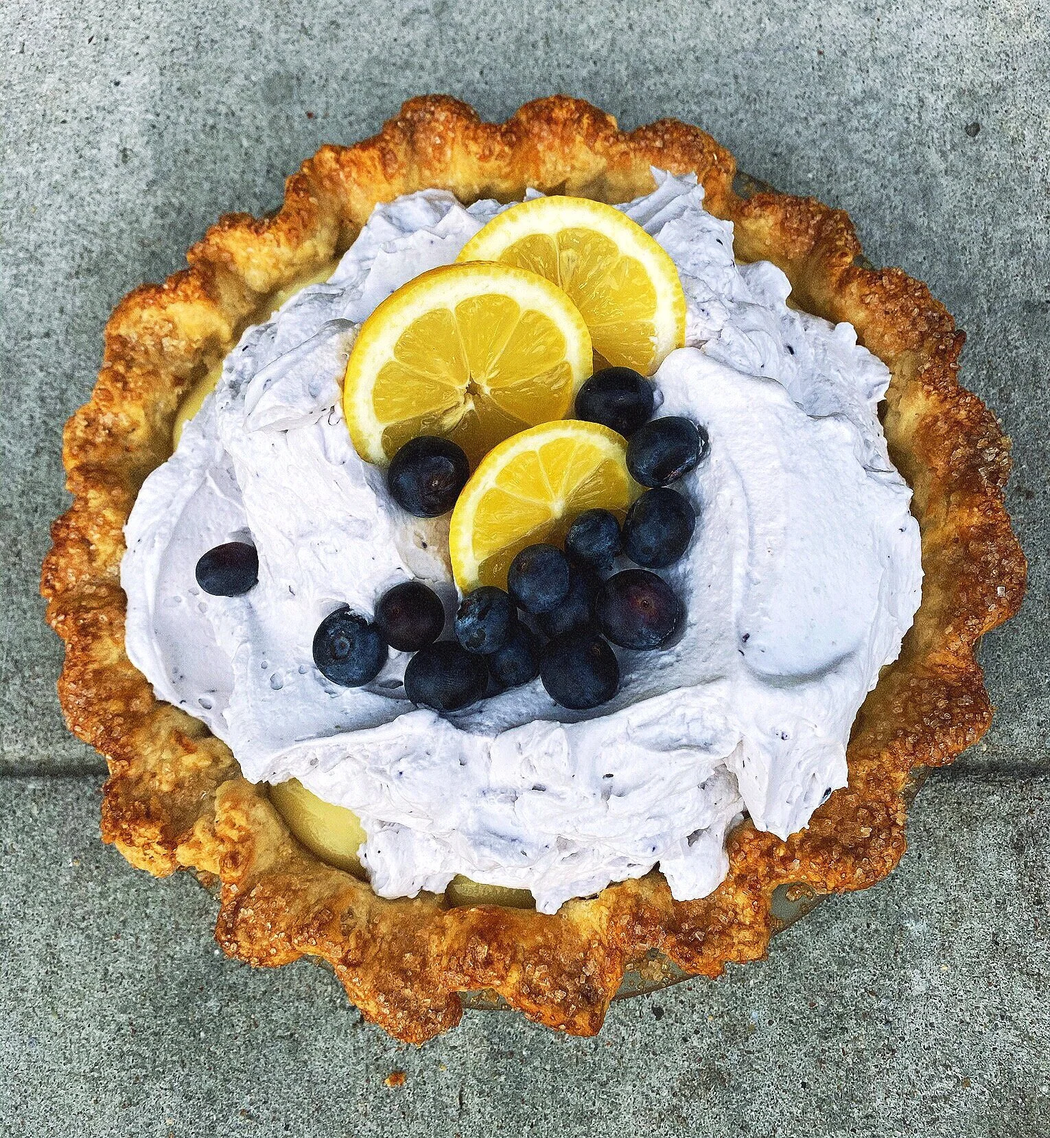 One of Jane’s Ice Box Pies filled with the creamiest lemon filling and topped with a light blueberry whip.