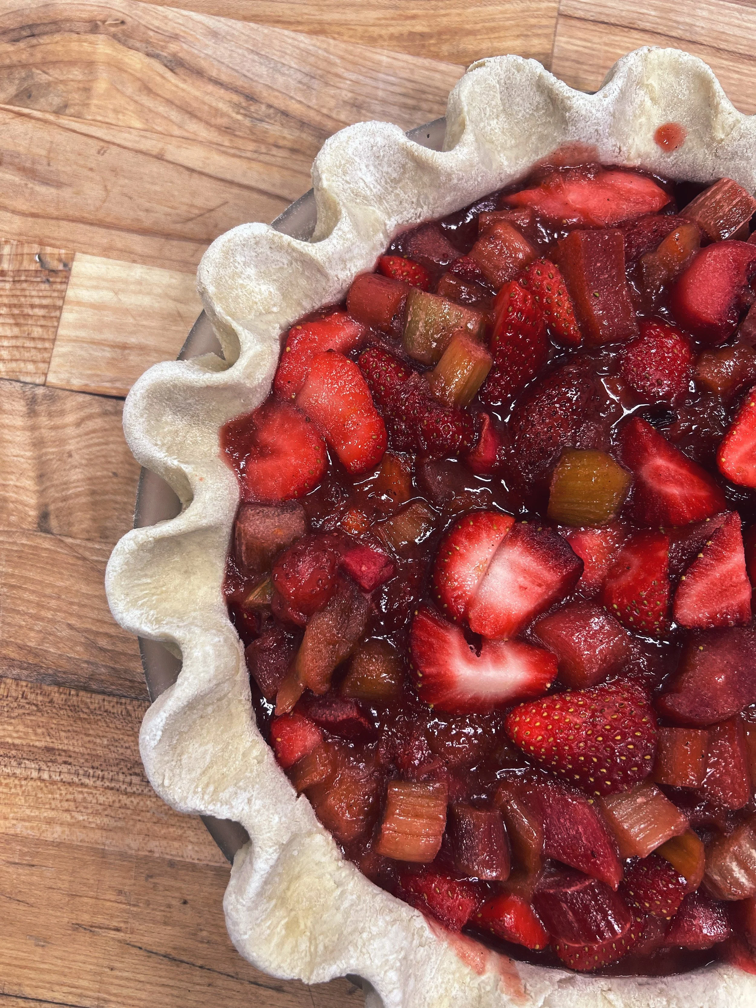 Texas strawberries are IN SEASON!! This is a classic spring pie. It’s sweet and tart and Rhubarb is popping up here in early Spring with cool evenings. I love to pair it with a little drizzle of condensed milk or Vanilla Bean ice cream.
